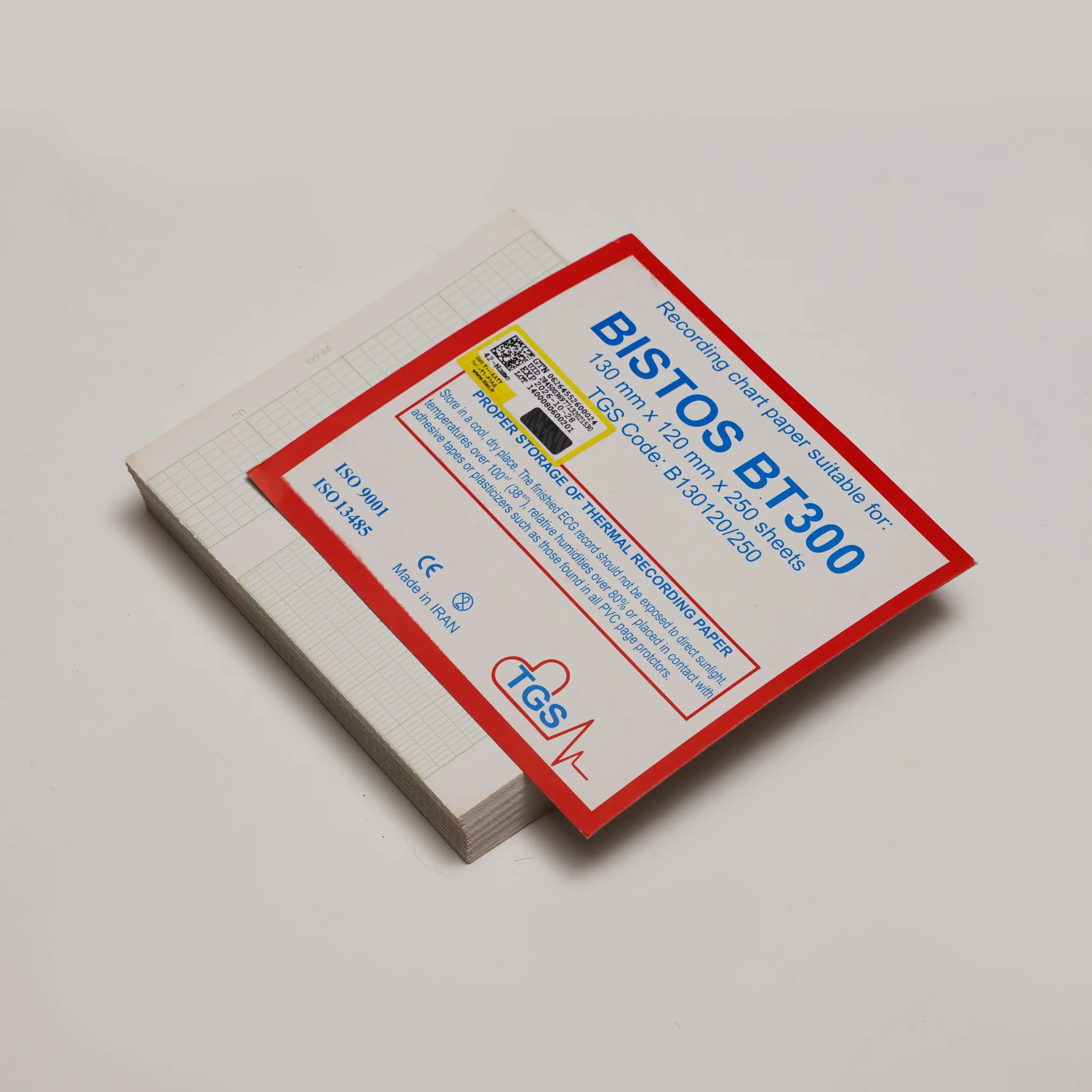 کاغذ فتال مانیتورینگ Bistos 120×130 میلیمتر برند TGS بهصورت کتابی (Z-fold) و 250 برگی عرضه میشود. این کاغذ حرارتی با خطوط شبکهای، چاپی دقیق و خوانا از ضربان قلب جنین و انقباضات رحمی ارائه میدهد و مخصوص دستگاههای Bistos BT-300 و BT-350 طراحی شده است.